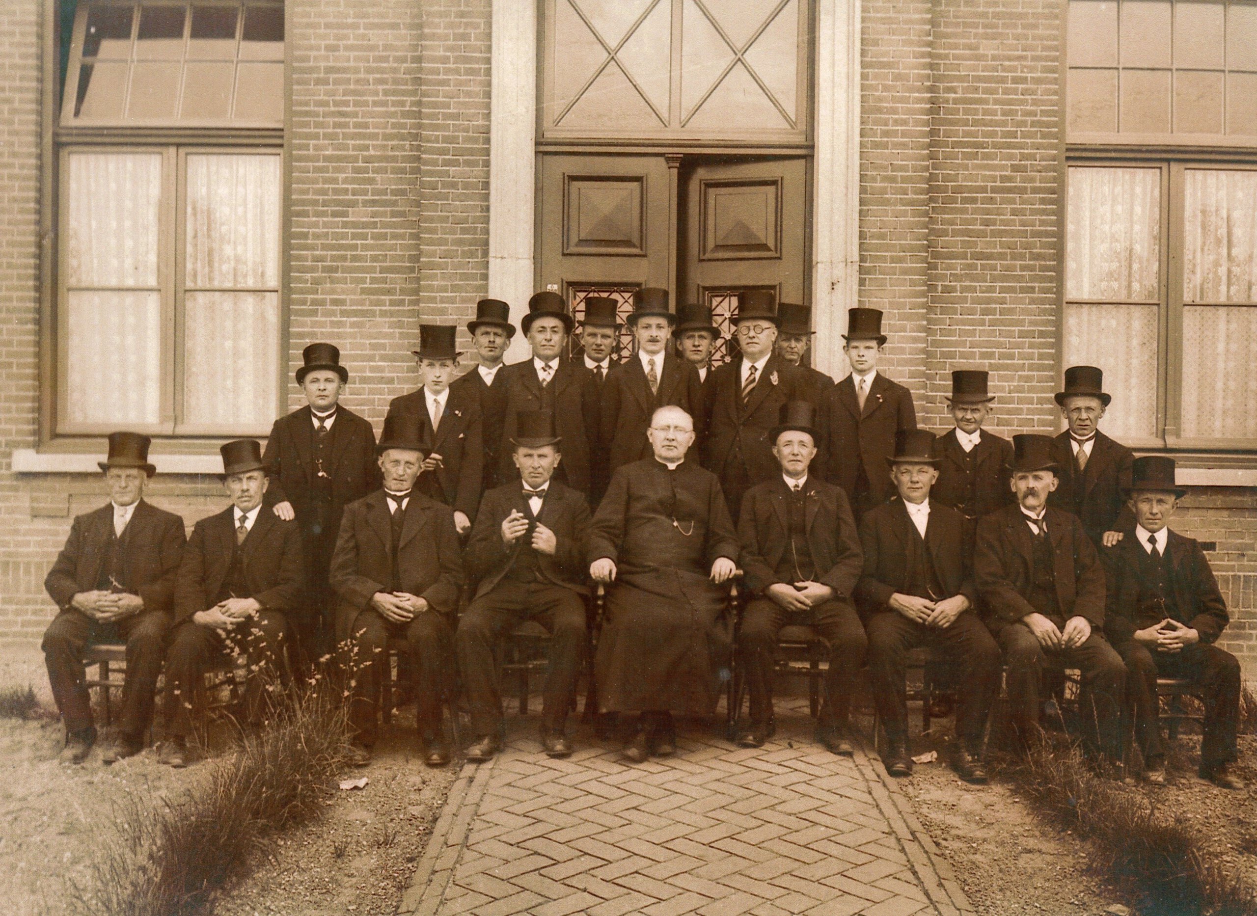 Vlnr: Zittend, NN, Graard van Ooij, NN, Fried Sanders (Kerkmeester), Pastoor Piggen, Peer van de Heuvel, Pietje Joosten (kerkmeester), Klaas Goossens (1ste molenaar Zeilberg), Piet van Ooij, 2de rij: Nard van Bommel (Alias Bommelse Cisse Nardje), Rodts (onderwijzer), Nol van den Eijnden (Wethouder), Christ Bremmers (hoofdonderwijzer), Wouter Kortooms, Herman Wildschut (onderwijzer), Jantje Brunas, NN, 3de rij: 4x NN.