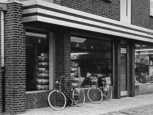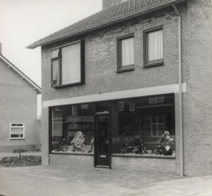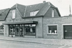 Schoenenwinkel Toon en Maria van den Heuvel. Zij hebben de winkel later uigebreid naar links, op het braakliggend stuk grond.